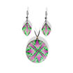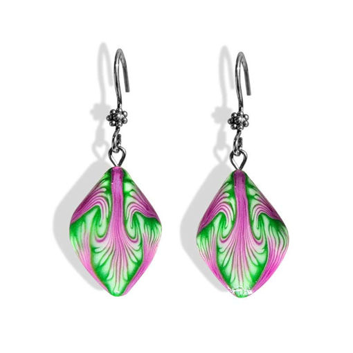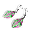 Norsk design og produksjon. Øredobber Roseopicta, Grønn og lilla farger. Overflaten er blank, slippet og lakkert. Størrelse på ørepynt uten opphenget: 2x1,5 cm, tykkelse 2 mm. Mønster tilnærmet lik på begge sider, ikke malt og ikke limt på, håndlaget. Se i beskrivelsen nede hvordan smykke ble laget.