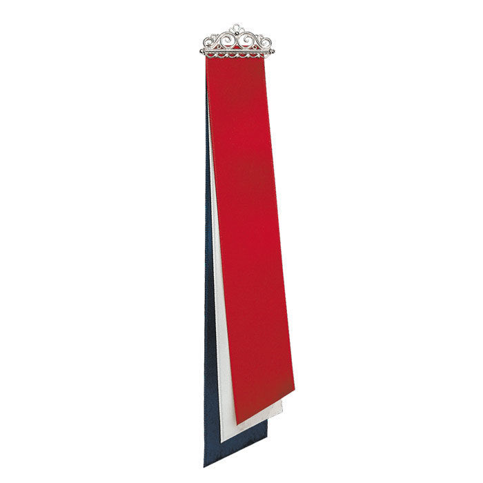 17. mai sløyfe med kongekrune i oksidert sølv og 28 cm lange sløyfeband i raudt, kvitt og blått. Den kan brukast igjen, år etter år, og er ei fin gåve til store og små.