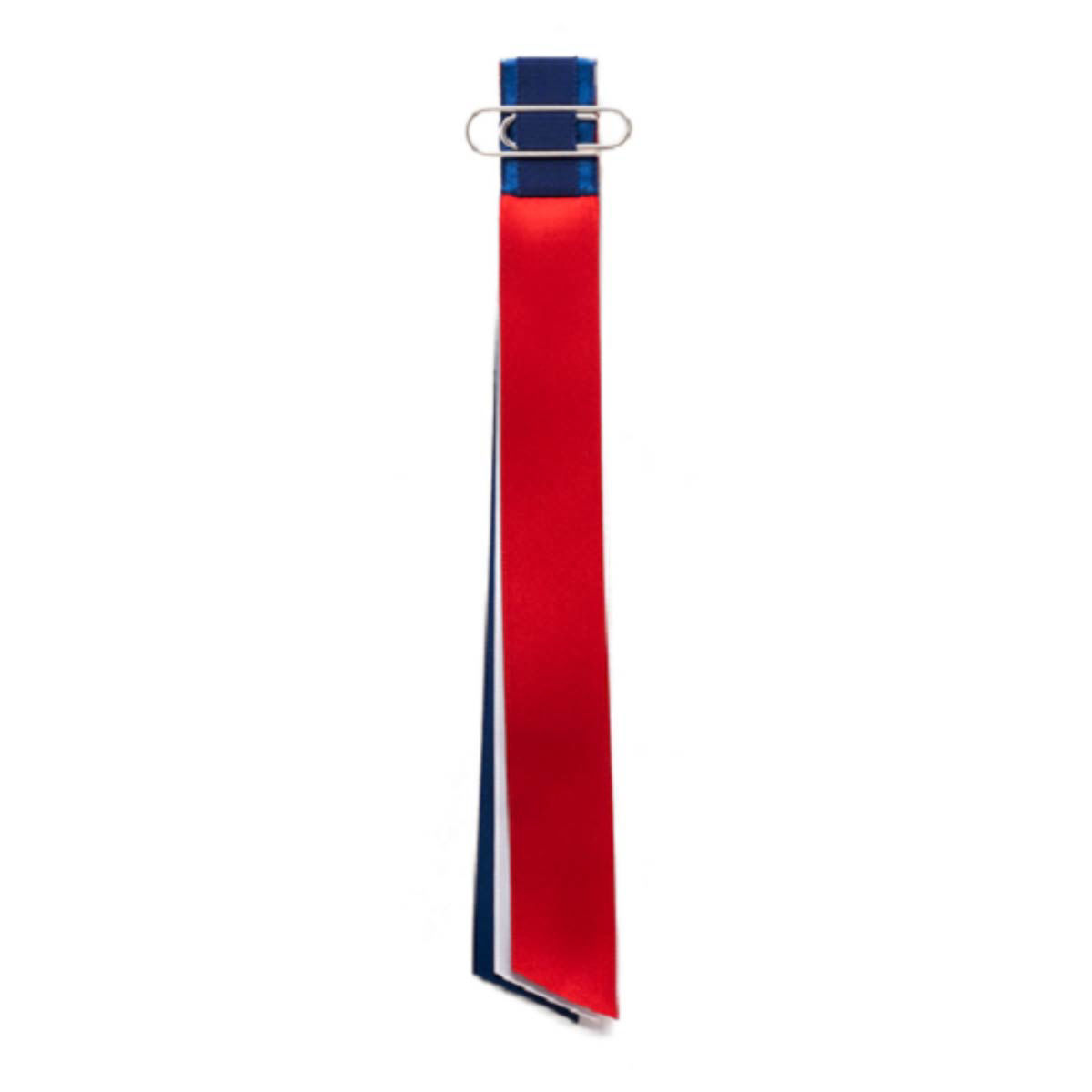 17. mai sløyfe med hjartemotiv i sølv og 28 cm lange sløyfeband i raudt, kvitt og blått. Den kan brukast igjen, år etter år, og er ei fin gåve til store og små.