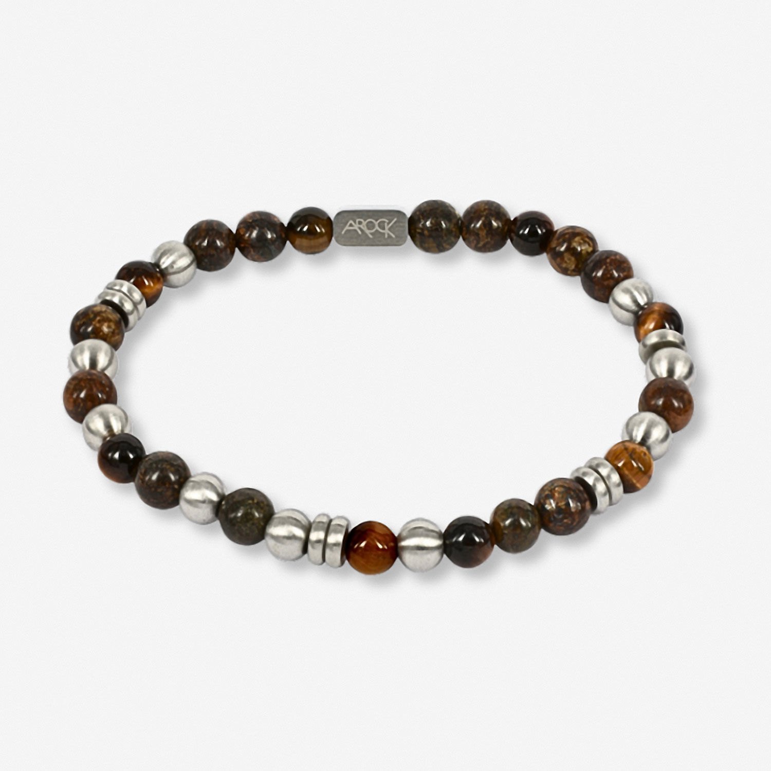 Eddie armband är tillverkat av ädelstenar i bruna toner från Bronzit och Tigeröga, med detaljer i matt Kirurgiskt Rostfritt Stål. Detta kularmband är 6 mm brett och 19,5 cm långt med en elastisk passform.