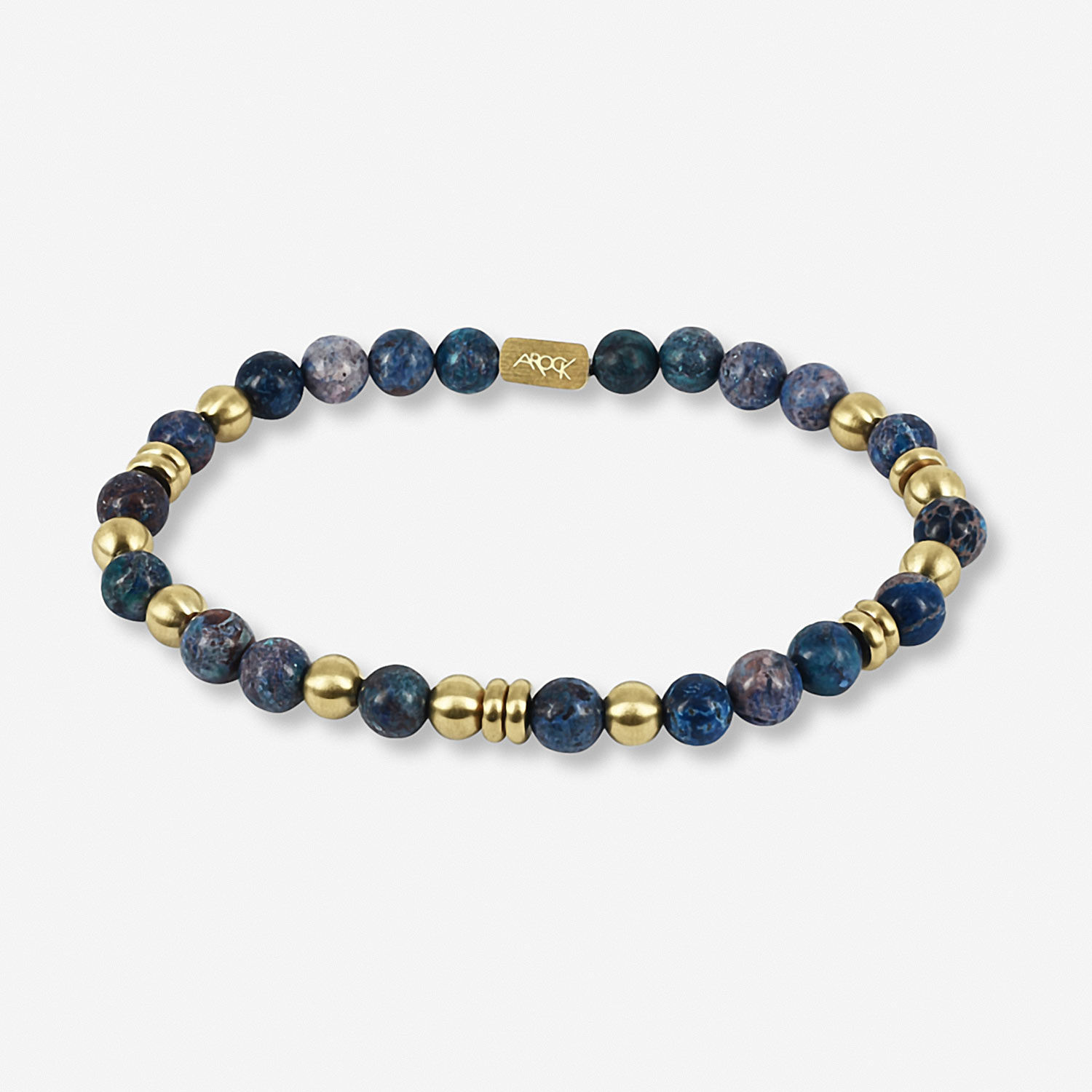 Eddie armband är tillverkat av ädelstenar i blå toner från Emperor med detaljer i matt 14 Karat Guldpläterat (PVD) Kirurgiskt Rostfritt Stål. Detta kularmband är 6 mm brett och 19,5 cm långt med en elastisk passform.