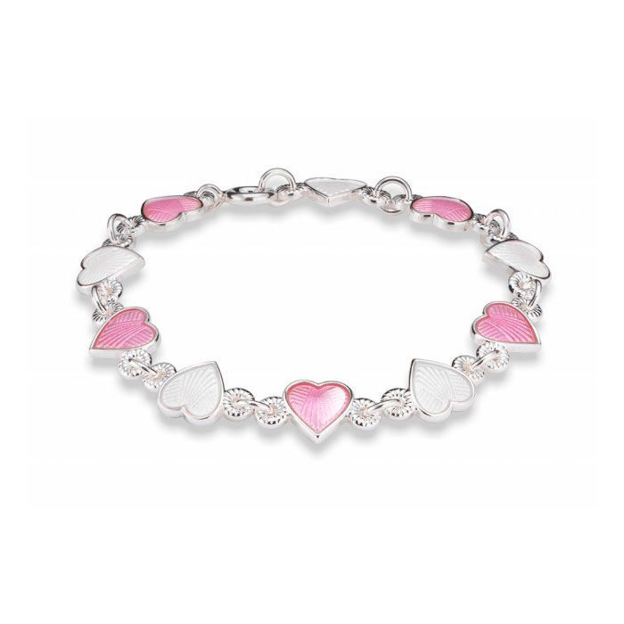 Armbånd i sølv, lengde 15 cm med hjerter i rosa og hvitt farge Pia&Per er kjent for sine tradisjonsrike, norske sølvsmykker med emalje. I over 70 år har disse smykkene gledet både små og store gutter og jenter. Kolleksjonen inkluderer kjeder, armbånd, ringer og ørepynt.