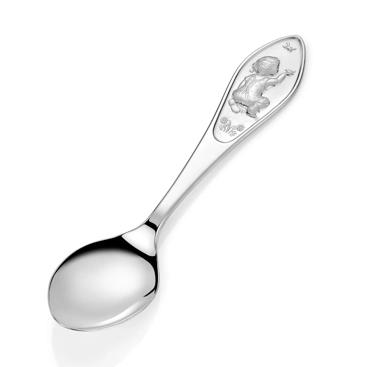 Skje i stål med motiv i sølv og ekte emalje. Kan graveres med navn og dato. Lengde: 14 cm.