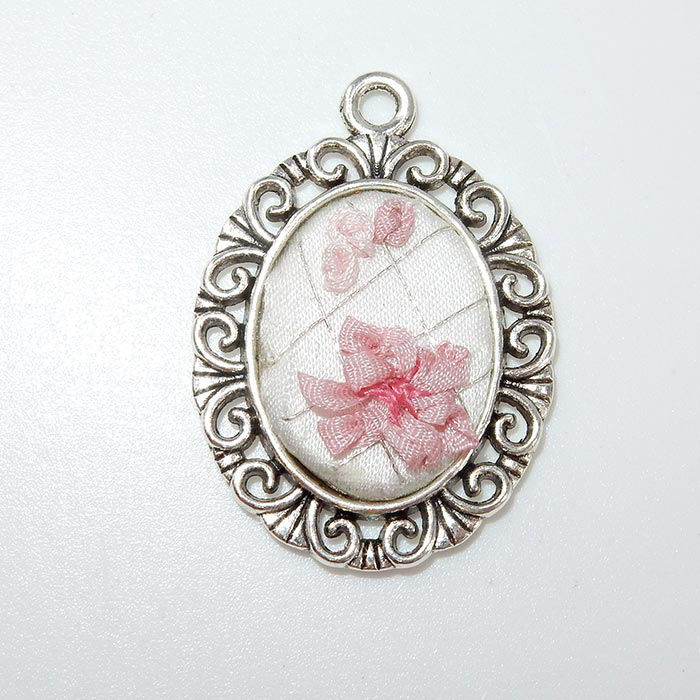 YAde broderte smykke er håndbrodert med ekte silkebånd og forskjellige tråder på en bakgrunn av ekte silke eller bomull. Smykkerammen er av belagt metall.
