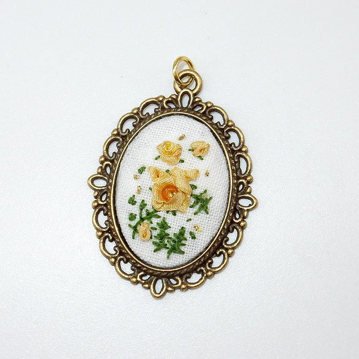 YAde broderte smykke er håndbrodert med ekte silkebånd og forskjellige tråder på en bakgrunn av ekte silke eller bomull. Smykkerammen er av belagt metall.