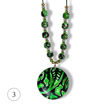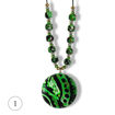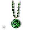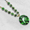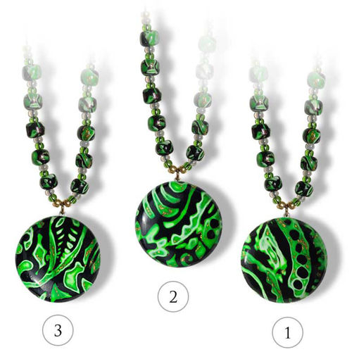 Håndlaget Collier laget i teknikken Hidden Magic, med grønn & sort mønster, 3 varianter. Abstrakt mønster er kun på 1 side. Overflaten er blank og lakkert, polert. Størrelse ca 34 x 34 mm, håndlaget. Snor med lås er inkl. i prisen, 45 cm. Overflaten er blank, slippet og lakkert. Se i beskrivelsen nede hvordan smykke ble laget.