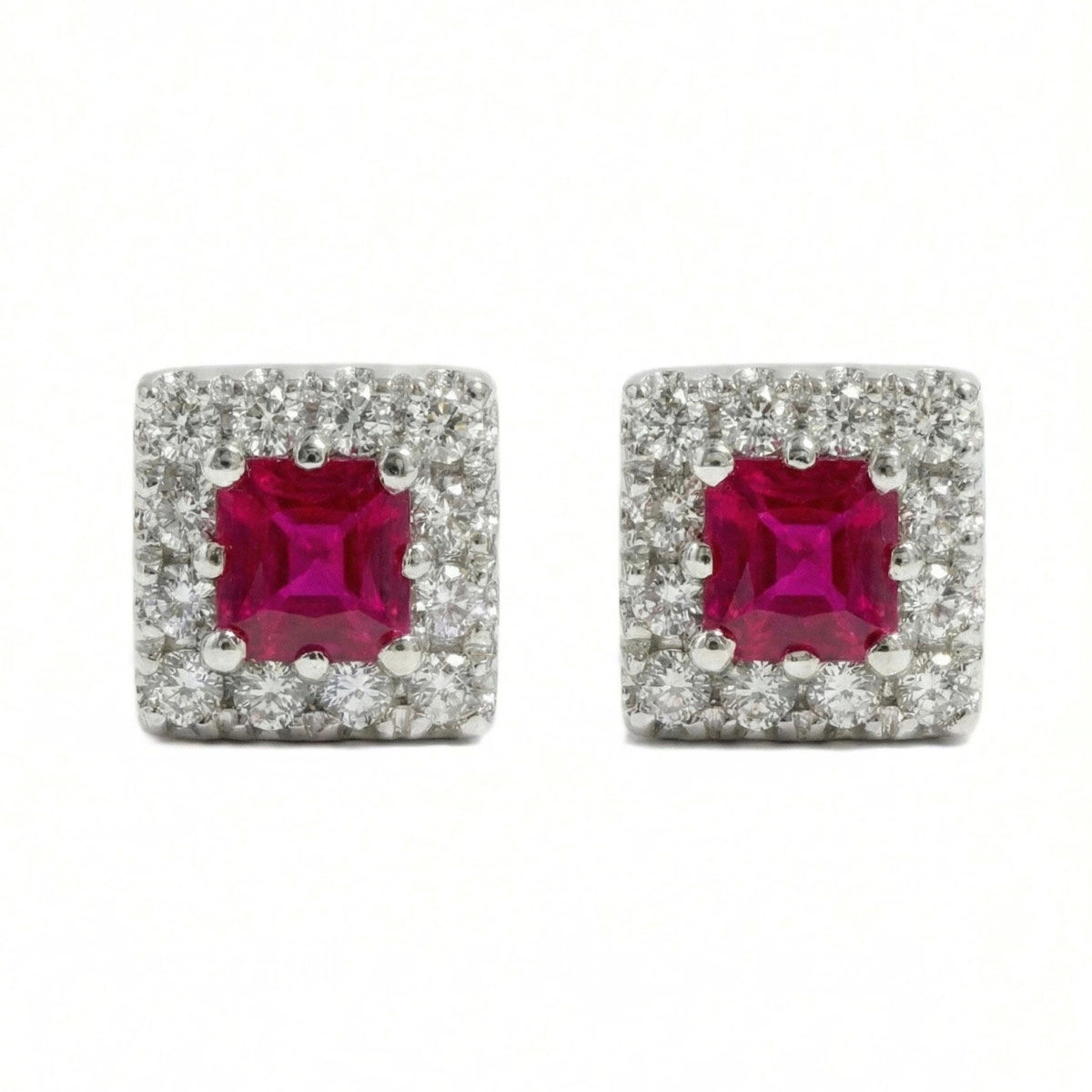 Diamantøredobber i hvitt gull med rubin og diamanter 0,12 ct W-Si. De elegante diamantøredobbene med rosettmotiv er prydet med forlokkende røde rubiner og omringet av skinnende diamanter. Disse blendende diamantøredobbene inneholder rubiner og diamanter av høy kvalitet, som vil bevare sin glans og sjarm i mange år framover.