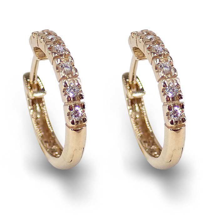 Diamantøredobber i gult gull 14kt/585 med diamanter tilsammen 0,12 ct W-Si. Et par vakre diamantøredobber, dekorert med mange fine diamanter, samlet 0,12 karat i W/SI-kvalitet. Disse slående diamantøredobbene glitrer vakkert og vil tilføre den siste touchen til ditt perfekte antrekk. Diamantøredobbene er ideelle for en rekke anledninger. De vil også være den perfekte gaven å gi til en spesielt kjær person. Gull øreringer er en tidløs favoritt som utstråler en blendende skjønnhet og eleganse. Laget av det edle gullet, kommer gull øreringer i en rekke stiler og design som appellerer til forskjellige smaker og anledninger.