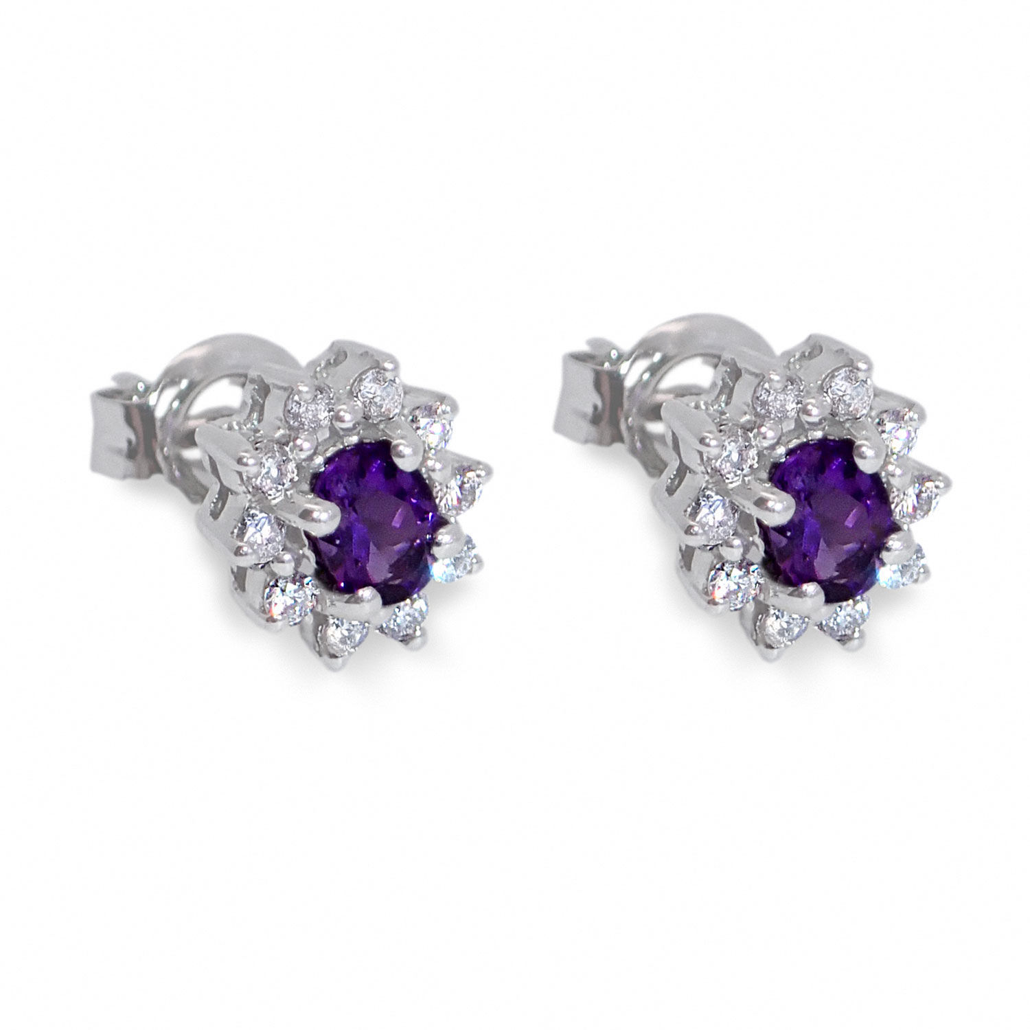 Diamantøredobber i hvitt gull med ametyst og diamanter 0,18 ct W-Si. De elegante diamantøredobbene med rosettmotiv er prydet med forlokkende ametyster og omringet av skinnende diamanter. Disse blendende diamantøredobbene inneholder ametyst og diamanter av høy kvalitet, som vil bevare sin glans og sjarm i mange år framover. Størrelse: 7 x 6 mm.