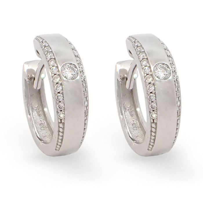 Diamantøredobber i hvitt gull 14kt/585 med diamanter tilsammen 0,24 ct W-Si. Et par vakre diamantøredobber, dekorert med mange fine diamanter, samlet 0,24 karat i W/SI-kvalitet. Disse slående diamantøredobbene glitrer vakkert og vil tilføre den siste touchen til ditt perfekte antrekk. Diamantøredobbene er ideelle for en rekke anledninger. De vil også være den perfekte gaven å gi til en spesielt kjær person. Gull øreringer er en tidløs favoritt som utstråler en blendende skjønnhet og eleganse. Laget av det edle gullet, kommer gull øreringer i en rekke stiler og design som appellerer til forskjellige smaker og anledninger.