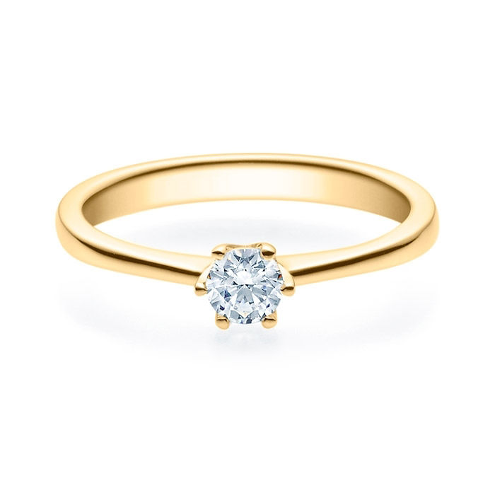 Diamantserie Magic Moments. Klassisk enstens diamantring med 6 klør. Ringen leveres i 14 karat hvitt, gult og rødt gull eller Platina 950.