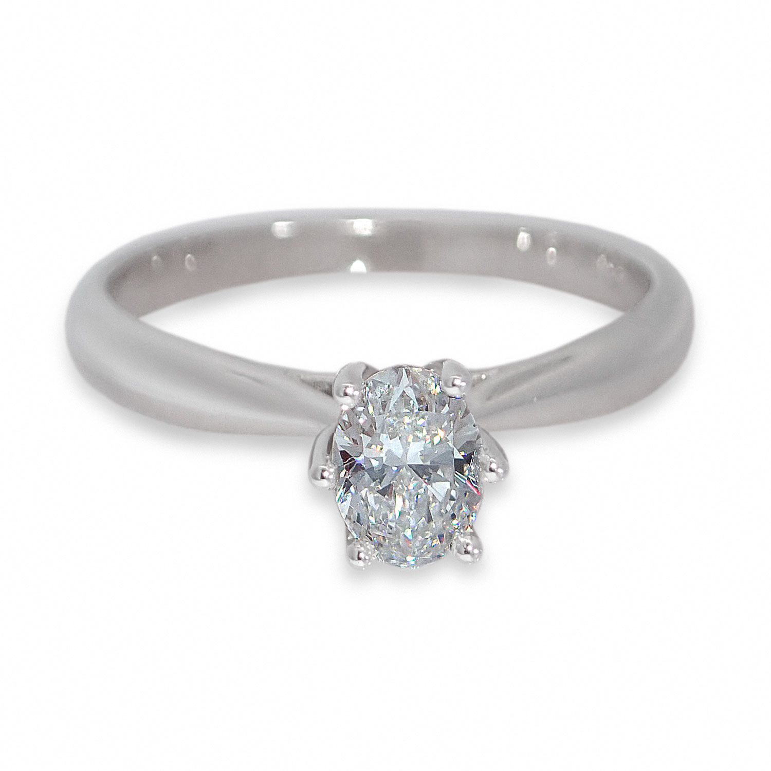 Et snev av tidløs eleganse. Denne diamantringen i hvitt gull med en perfekt oval diamant kombinerer utsøkt håndverk med overlegen kvalitet.