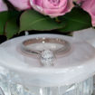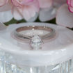 Den strålende ringen prydes av en oval GIA-sertifisert diamant på 0,50 carat, med den høyeste fargegraderingen, River, som betyr at den er helt fargeløs. Diamanten har klarhet VS2, noe som innebærer at den ikke har synlige inneslutninger for det blotte øye. Dette mesterverket har også trippel excellent i slip, proporsjoner og polering, noe som sikrer en blendende lysrefleksjon og imponerende briljans.