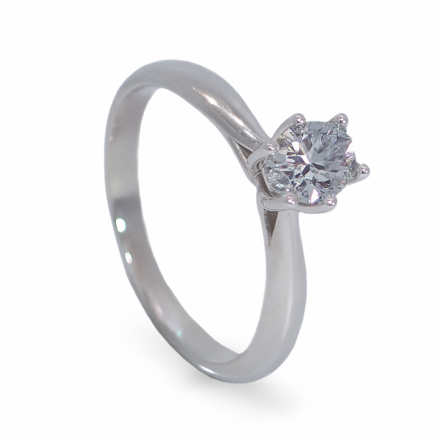 Denne utsøkte diamantringen i hvitt gull utstråler tidløs eleganse og raffinement. En glitrende diamant, nøye utvalgt for sin gnistrende skjønnhet, sitter i en klassisk fatning med 6 delikate klør.