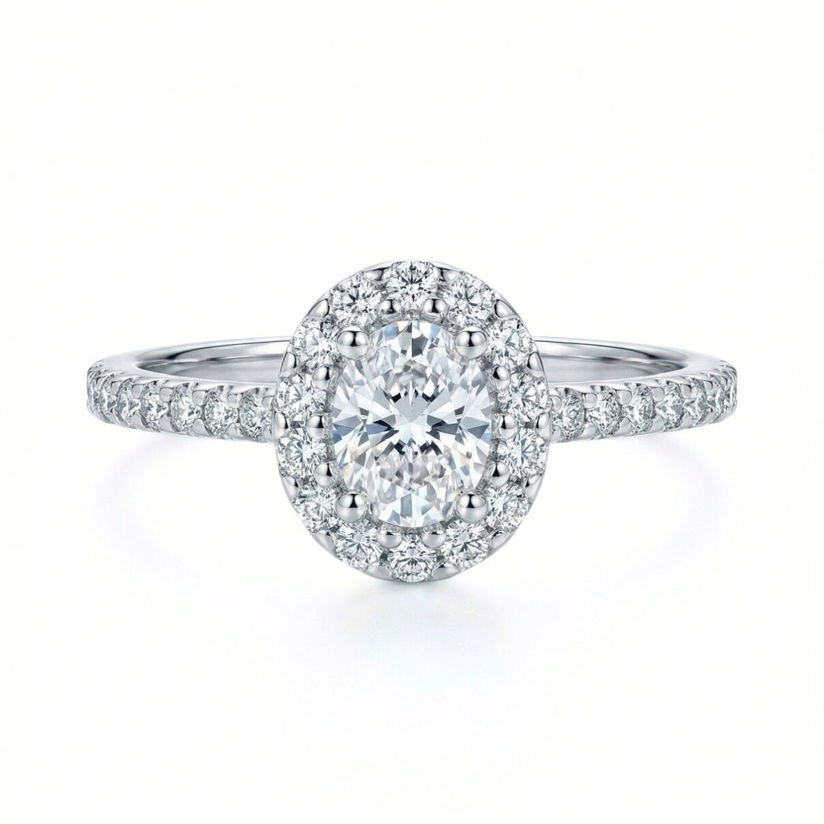 Diamantring i 14 kt hvitt gull med 0,28 ct W‑Si. Burkhardt & Bischoff Denne luksuriøse diamantringen fra Burkhardt & Bischoff er laget i 14 karat (585) hvitt gull og prydet med en stor ovalslipt diamant som midtpunkt. Rundt hoveddiamanten glitrer en halo av mindre diamanter, elegant innfattet for å fremheve den imponerende briljansen. Med totalt 0,28 ct diamanter i kvalitet W‑Si og en diamantbesatt ringbånd, utstråler smykket tidløs eleganse og eksklusivitet. Perfekt som forlovelsesring, jubileumsgave eller et unikt smykke til livets mest spesielle øyeblikk.
