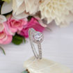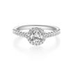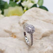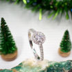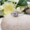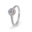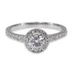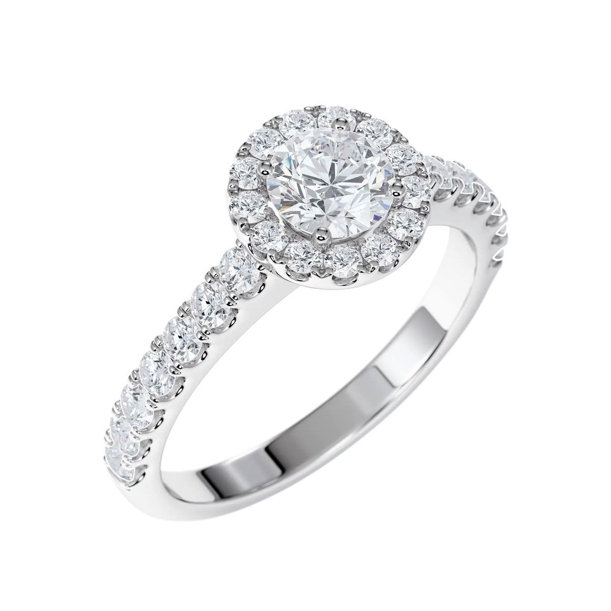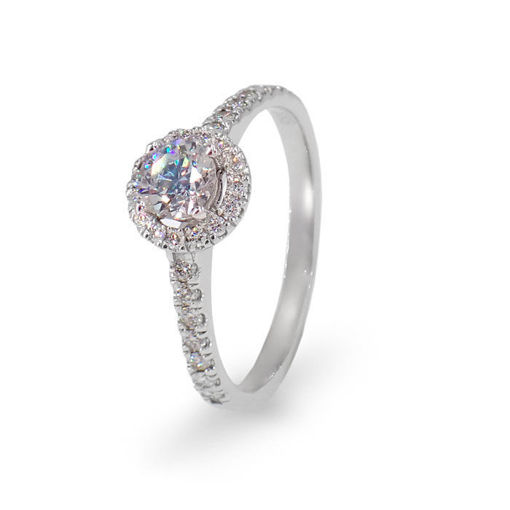 Ring i hvitt gull 14kt/585 med diamanter senter diamant 0,42 ct E-Si2 og side diamanter 0,37 ct TW-Si (tilsammen 0.79 ct.).Med GIA sertifikat. En Halo diamantring har en hoved diamant omringet av en serie mindre diamanter eller andre edelstener i en "halo" eller ring rundt midtsteinen. Midt diamanten er ofte plassert i midten av ringen og er hovedfokuset. Den omkringliggende haloen av diamanter gir en fantastisk optisk illusjon av en større sentral diamant og øker dermed den visuelle appell og glansen til ringen.
