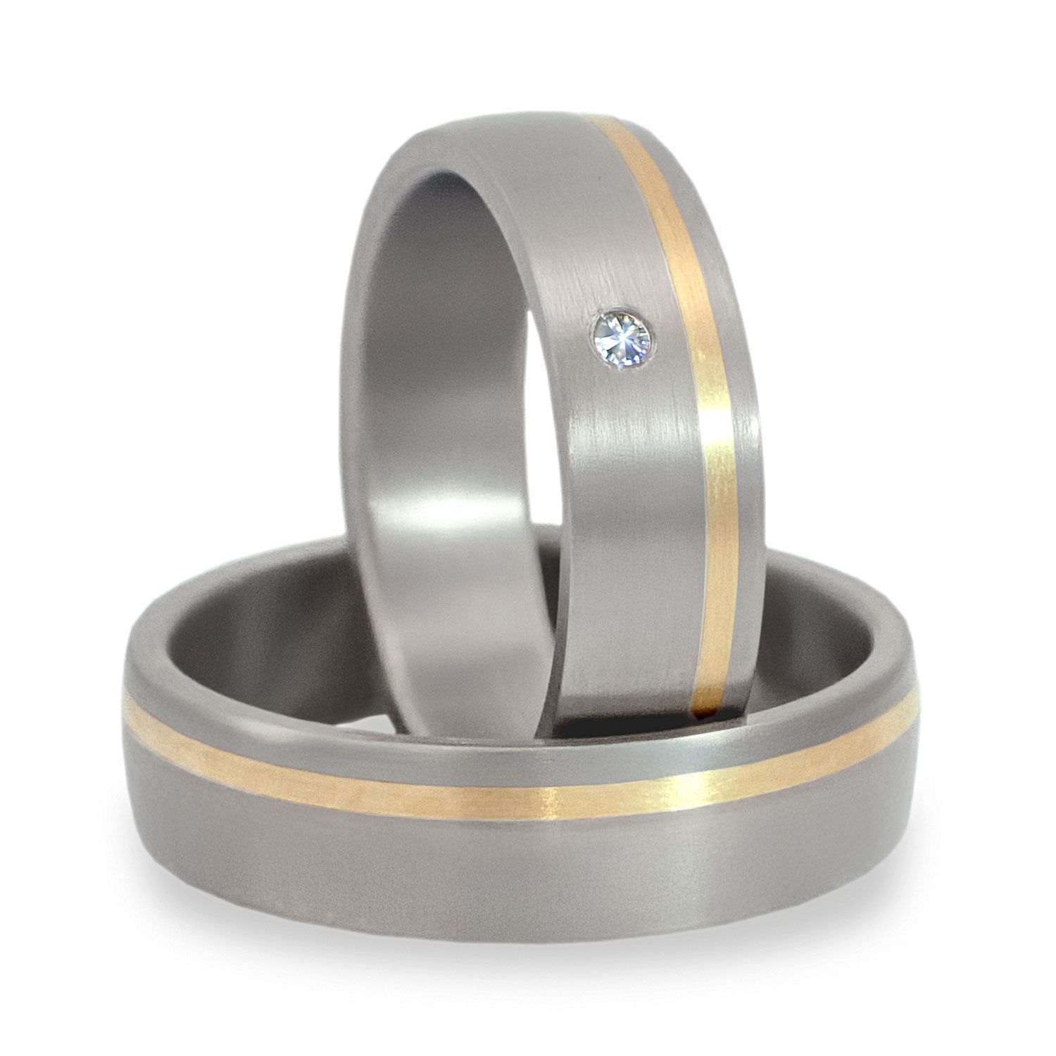 Pris pr par. Forlovelsesringer - gifteringer i titan & gult gull 14 kt. Kollection TITAN PLUS. Dameringen med 1 diamant 0,02 ct..