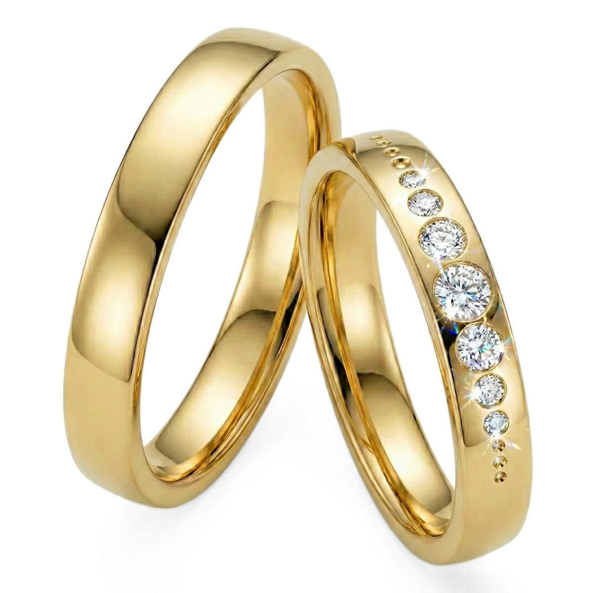 Forlovelsesringer - gifteringer fra Gerstner i gult gull 14kt/585, dameringen har en bredde på 3.5 mm og herreringen har bredde på 3.5 mm. Dameringen med 0,21 ct diamanter.