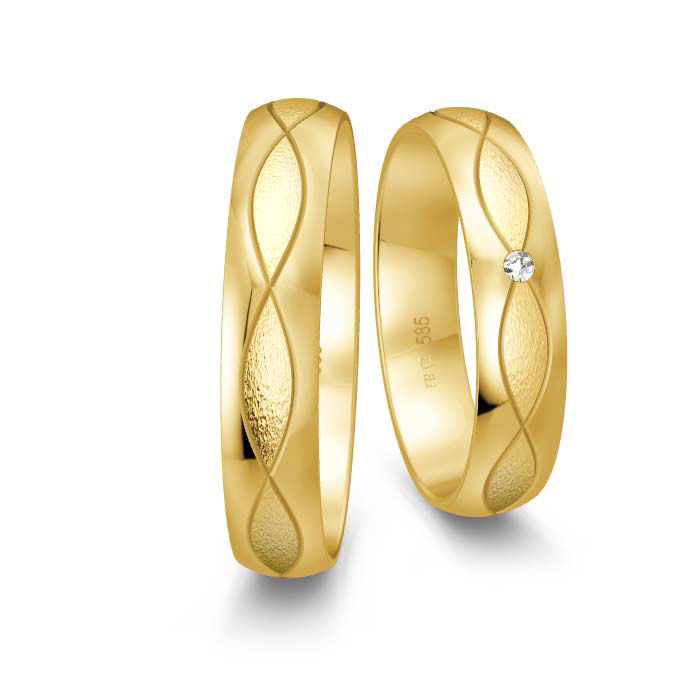 Forlovelsesringer - gifteringer fra Breuning i gult gull 14kt/585 i modell serie LOOP. Ringene har en bredde på 4.5 mm, 1.4 mm tykk. Dame ringen har 1 diamant i 0,02 ct i god kvalitet.