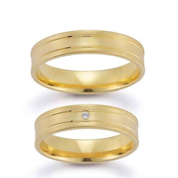 Forlovelsesringer - gifteringer fra Gerstner i gult gull 14kt/585, dameringen har en bredde på 5 mm og herreringen har bredde på 5 mm. Dameringen med 0,01 ct diamanter.