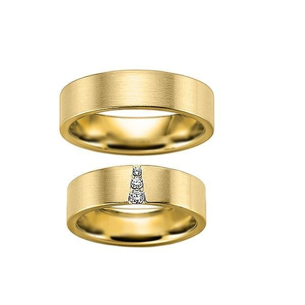 Forlovelsesringer - gifteringer fra Gerstner i gult gull 14kt/585, dameringen har en bredde på 6 mm og herreringen har bredde på 6 mm. Dameringen med 0,09 ct diamanter.