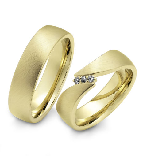 Forlovelsesringer - gifteringer fra Breuning i gult gull 14kt/585 i modell serie PRINZESSIN. Ringene har en bredde på 6 mm, 2 mm tykk. Dame ringen har 3 diamanter i tilsammen 0,055 ct i god kvalitet.