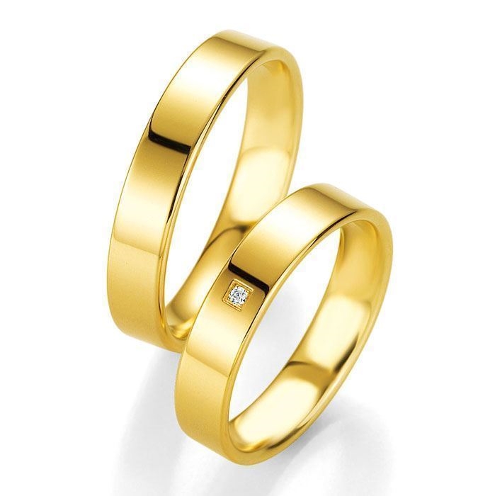 Forlovelsesringer - gifteringer fra Breuning i gult gull 9kt/375 i modell serie Profil Light. Ringene har en bredde på 4,5mm, 1,5 mm tykk. Dame ringen har 1 diamant i 0,01ct i god kvalitet.