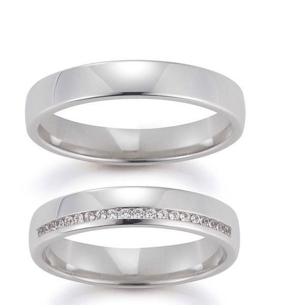 Forlovelsesringer - gifteringer fra Gerstner i hvitt gull 14kt/585, dameringen har en bredde på 4 mm og herreringen har bredde på 4 mm. Dameringen med 0,10 ct diamanter.