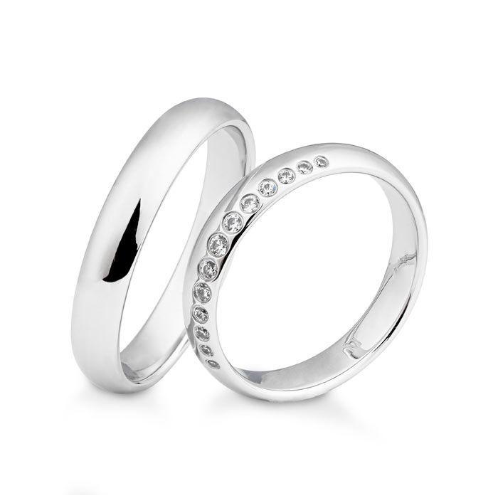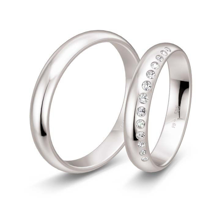 Forlovelsesringer - gifteringer fra Breuning i hvitt gull 14kt/585 i modell serie TRUST. Ringene har en bredde på 4 mm, 1.6 mm tykk. Dame ringen har 13 diamanter i tilsammen 0,133 ct i god kvalitet.