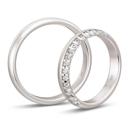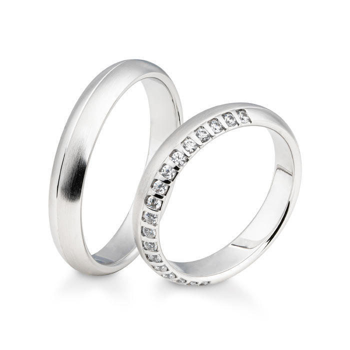 Forlovelsesringer - gifteringer fra Breuning i hvitt gull 14kt/585 i modell serie TRUST. Ringene har en bredde på 4 mm, 1.7 mm tykk. Dame ringen har 18 diamanter i tilsammen 0,27 ct i god kvalitet.