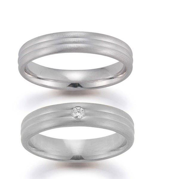 Forlovelsesringer - gifteringer fra Gerstner i hvitt gull 14kt/585, dameringen har en bredde på 4.5 mm og herreringen har bredde på 4.5 mm. Dameringen med 0,04 ct diamanter.