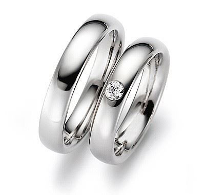 Forlovelsesringer - gifteringer fra Gerstner i hvitt gull 14kt/585, dameringen har en bredde på 4.5 mm og herreringen har bredde på 4.5 mm. Dameringen med 0,10 ct diamanter.