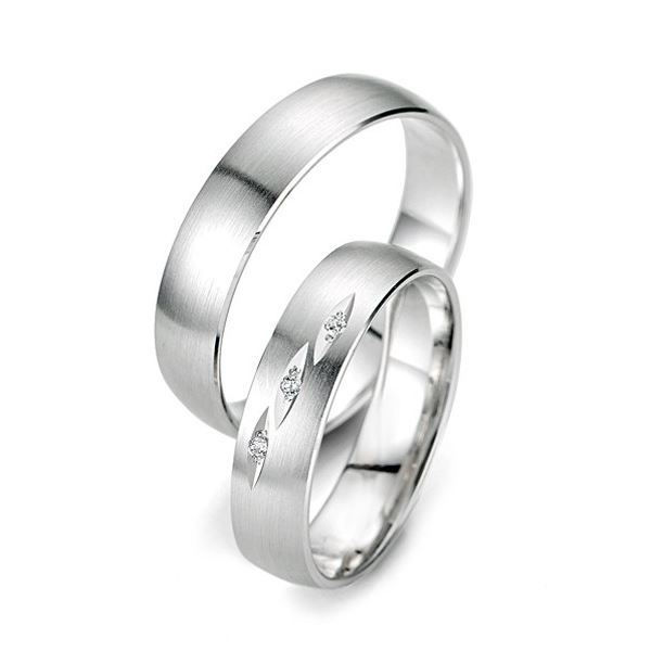 Forlovelsesringer - gifteringer fra Breuning i hvitt gull 14kt/585 i modell serie Smart line. Ringene har en bredde på 5 mm, 1,3 mm tykk. Dame ringen har 3 diamant i 0,03 ct i god kvalitet. Se video lenger ned under beskrivelse.