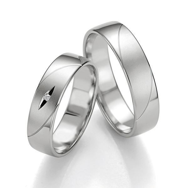 Forlovelsesringer - gifteringer fra Breuning i hvitt gull 14kt/585 i modell serie Smart line. Ringene har en bredde på 5,5 mm, 1,3 mm tykk. Dame ringen har 1 diamant i 0,01 ct i god kvalitet.