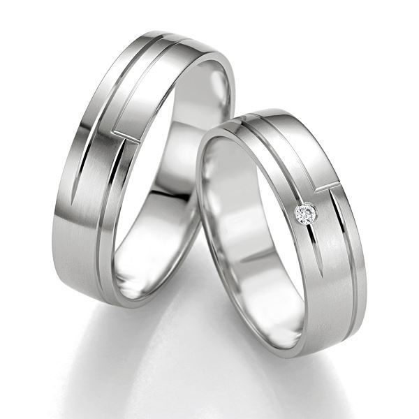 Forlovelsesringer - gifteringer fra Breuning i hvitt gull 14kt/585 i modell serie Smart line. Ringene har en bredde på 5,5 mm, 1,3 mm tykk. Dame ringen har 1 diamant i 0,02 ct i god kvalitet.