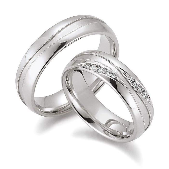 Forlovelsesringer - gifteringer fra Gerstner i hvitt gull 14kt/585, dameringen har en bredde på 6 mm og herreringen har bredde på 6 mm. Dameringen med 0,092 ct diamanter.