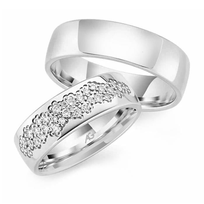Forlovelsesringer - gifteringer fra Gerstner i hvitt gull 14kt/585, dameringen har en bredde på 6.5 mm og herreringen har bredde på 6.5 mm. Dameringen med 0,288 ct diamanter.