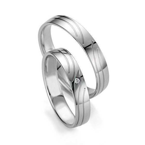 Forlovelsesringer - gifteringer fra Breuning i hvitt gull 9kt/375 i modell serie Slim line. Ringene har en bredde på 4 mm. Dame ringen har 1 diamant i 0,01ct i god kvalitet. Se video lenger ned under beskrivelse.