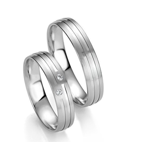 Forlovelsesringer - gifteringer fra Breuning i hvitt gull 9kt/375 i modell serie Slim line. Ringene har en bredde på 4,5 mm. Dame ringen har 2 diamant i 0,02ct i god kvalitet. Se video lenger ned under beskrivelse.