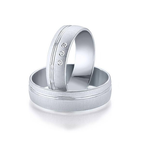 Forlovelsesringer - gifteringer fra Breuning i hvitt gull 9kt/375 i modell serie Smart line. Ringene har en bredde på 6 mm, 1,3 mm tykk. Dame ringen har 3 diamant i 0,03 ct i god kvalitet.