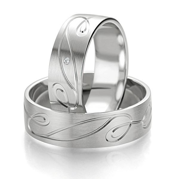 Forlovelsesringer - gifteringer fra Breuning i hvitt gull 9kt/375 i modell serie Smart line. Ringene har en bredde på 6,5 mm, 1,3 mm tykk. Dame ringen har 1 diamant i 0,006 ct i god kvalitet.