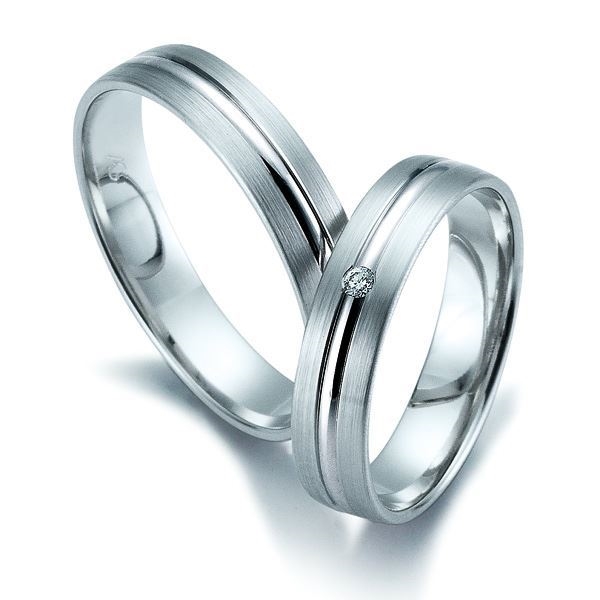 Forlovelsesringer - gifteringer fra Gettmann i hvitt gull 9kt/375. Ringene har en bredde på 4,5 mm, 1,2 mm tykk. Dame ringen har 1 diamant i 0,02 ct i god kvalitet.