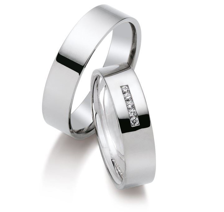 Forlovelsesringer - gifteringer fra Gettmann i hvitt gull 9kt/375. Ringene har en bredde på 5,5 mm, 1,6 mm tykk. Dame ringen har 5 diamanter - 0,05 ct i god kvalitet.