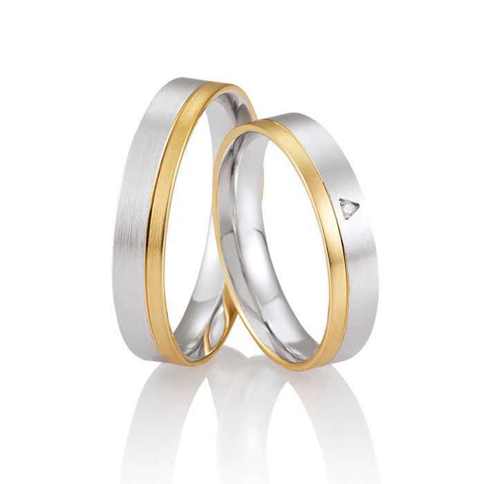 Forlovelsesringer - gifteringer fra Breuning i hvitt & gult gull 14kt/585 i modell serie LOOP. Ringene har en bredde på 4.5 mm, 1.4 mm tykk. Dame ringen har 1 diamant i 0,015 ct i god kvalitet.