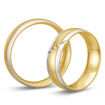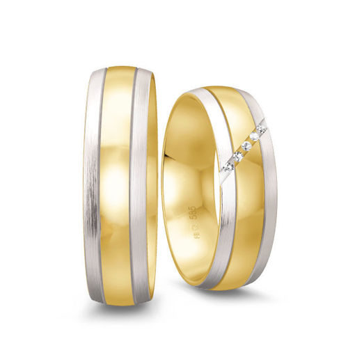 Forlovelsesringer - gifteringer fra Breuning i hvitt & gult gull 14kt/585 i modell serie LOOP. Ringene har en bredde på 5 mm, 1.5 mm tykk. Dame ringen har 5 diamanter i tilsammen 0,028 ct i god kvalitet.