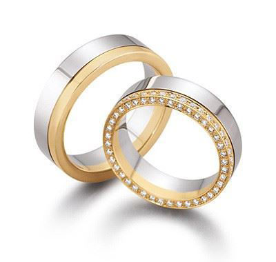 Forlovelsesringer - gifteringer fra Gerstner i hvitt & gult gull 14kt/585, dameringen har en bredde på 6 mm og herreringen har bredde på 6 mm. Dameringen med 0,26 ct diamanter.