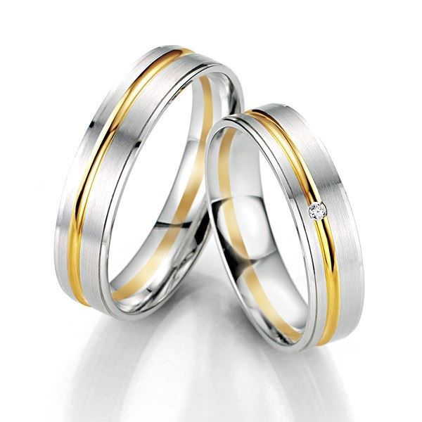 Forlovelsesringer - gifteringer fra Breuning i hvitt & gult gull 14kt/585 i modell serie Smart line. Ringene har en bredde på 5 mm, 1,3 mm tykk. Dame ringen har 1 diamant i 0,015ct i god kvalitet.