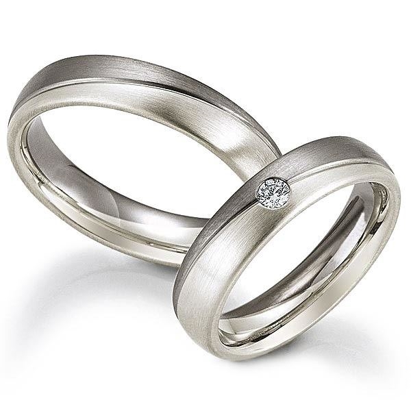 Forlovelsesringer - gifteringer fra Gerstner i palladium 500 & hvitt gull 9kt/375, dameringen har en bredde på 5 mm og herreringen har bredde på 5 mm. Dameringen med 0,08 ct diamanter.