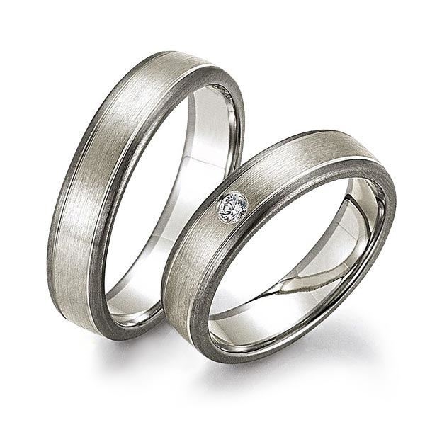Forlovelsesringer - gifteringer fra Gerstner i palladium 500 & hvitt gull 9kt/375, dameringen har en bredde på 5 mm og herreringen har bredde på 5 mm. Dameringen med 0,05 ct diamanter.