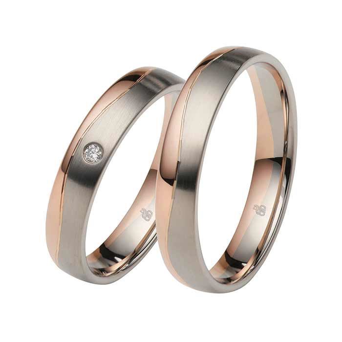 Pris pr par. Forlovelsesringer - gifteringer i palladium 500 & rosé gull 14 kt/585. Dameringen med 1 diamant 0,02 ct.